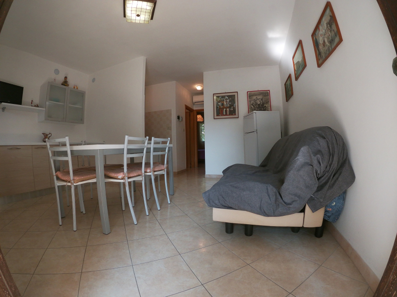 E' composto da un'ampia zona giorno con divano letto doppio, angolo cottura a quattro fuochi, il frigorifero, la tv, l'aria condizionata, le zanzariere e le inferriate alle finestre.